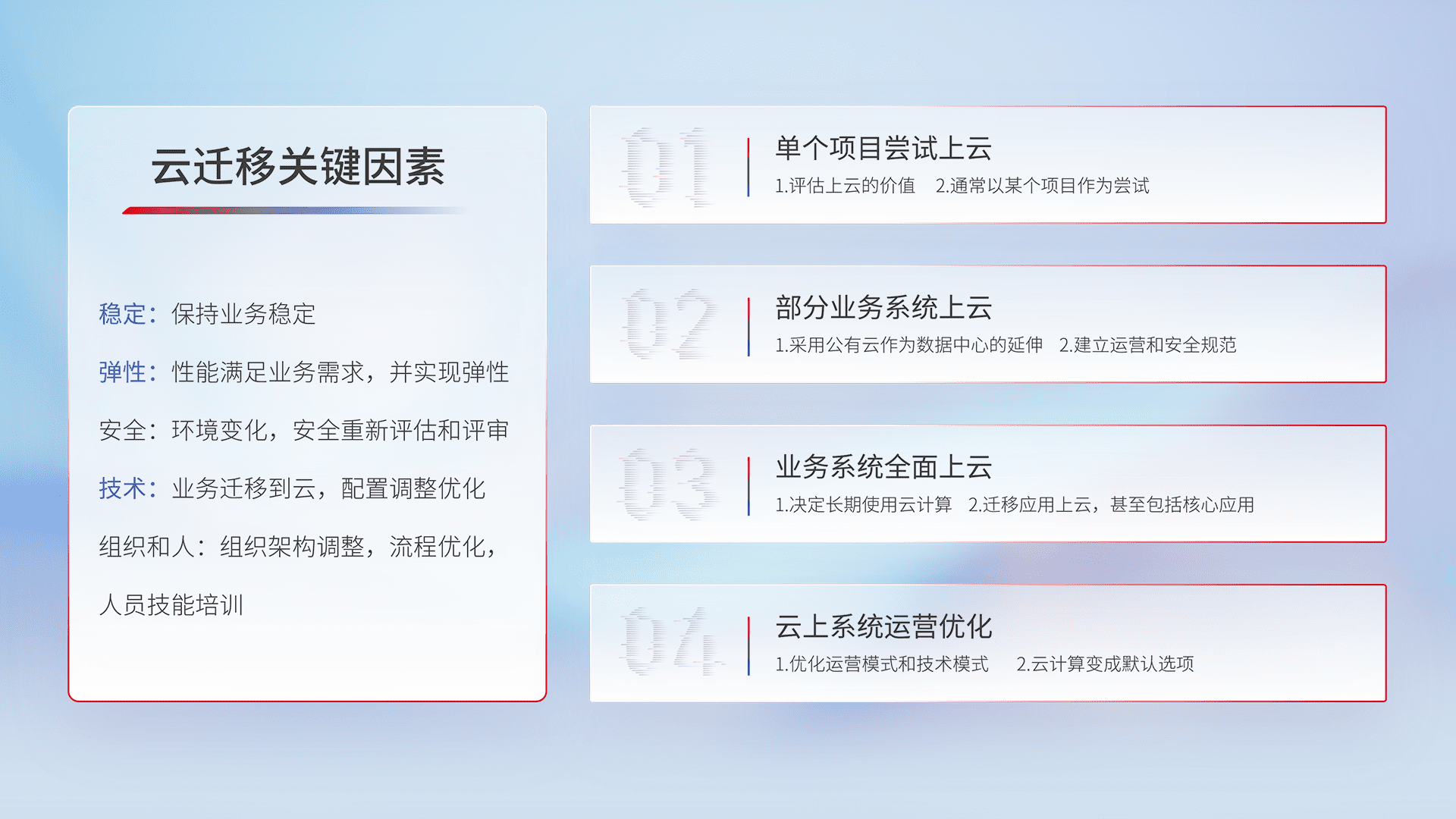 结合实际业务,,从规划设计、、云平台选型、、、、云原生改造、、、数据迁移、、、、集成交付,,,迁移全过程为客户识别最佳上云路径,,做好风险识别管理,,,设计网络架构、、、身份权限、、、安全审计合规、、、、操作审计、、、、日志审计、、、、监控告警策略、、多站点容灾设计等,,对云上基础设施进行整体规划,,提升IT治理水平,,,以满足弹性、、、、高可用、、、、高性能的需求。。。。