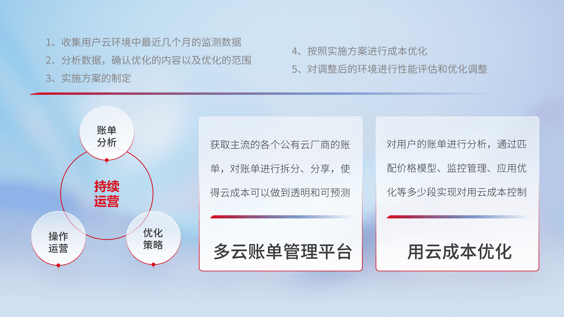 通过多云纳管,,,以统一的资源数据模型把客户的云资源进行抽象和封装,,进而实现对多云资源的统一操作,,保障云资源管理的可靠性、、稳定性与可用性。。。量身定制化运维内容,,,配置、、、开发运维、、、、补丁管理、、、备份、、、、监控、、、、认证和访问管理、、、、审计和日常巡检等,,保障在用云过程中的可靠度,,,稳定度以及高可用率。。