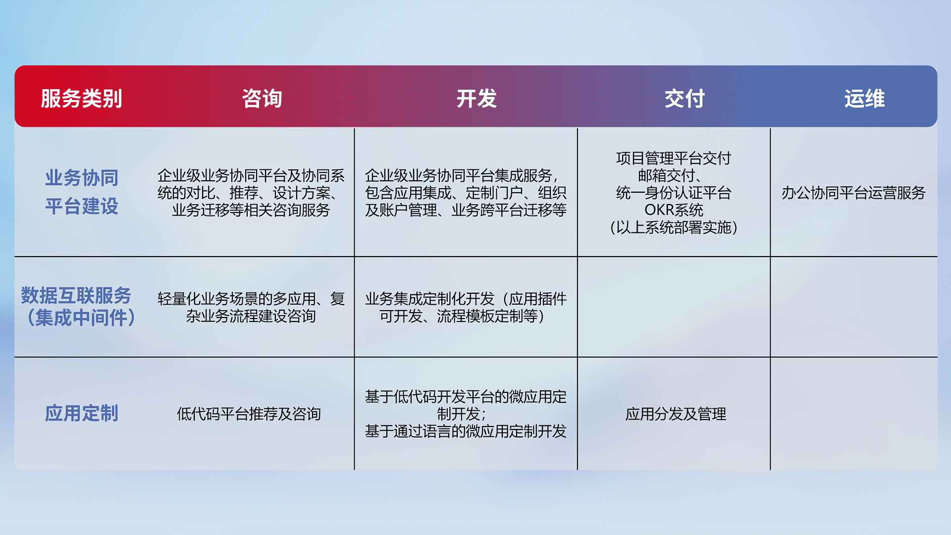 针对钉钉、、、企微、、、IDaas等平台级产品提供产品的规划、、、、方案、、、、交付、、、定制化开发等服务,,,,实现如统一协同办公、、智能客户服务、、、混合会议管理、、、智能数据查询、、等业务场景,,,实现数字化转型。。。。